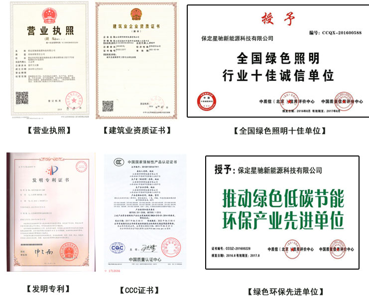 保定星馳新能源科技有限公司已通過AAA認(rèn)證,CCC認(rèn)證,ISO9001質(zhì)量體系認(rèn)證,是計量合格企業(yè),質(zhì)量信得過單位,擁有國家“城市及道路照明工程專業(yè)承包”二級資質(zhì)證書。